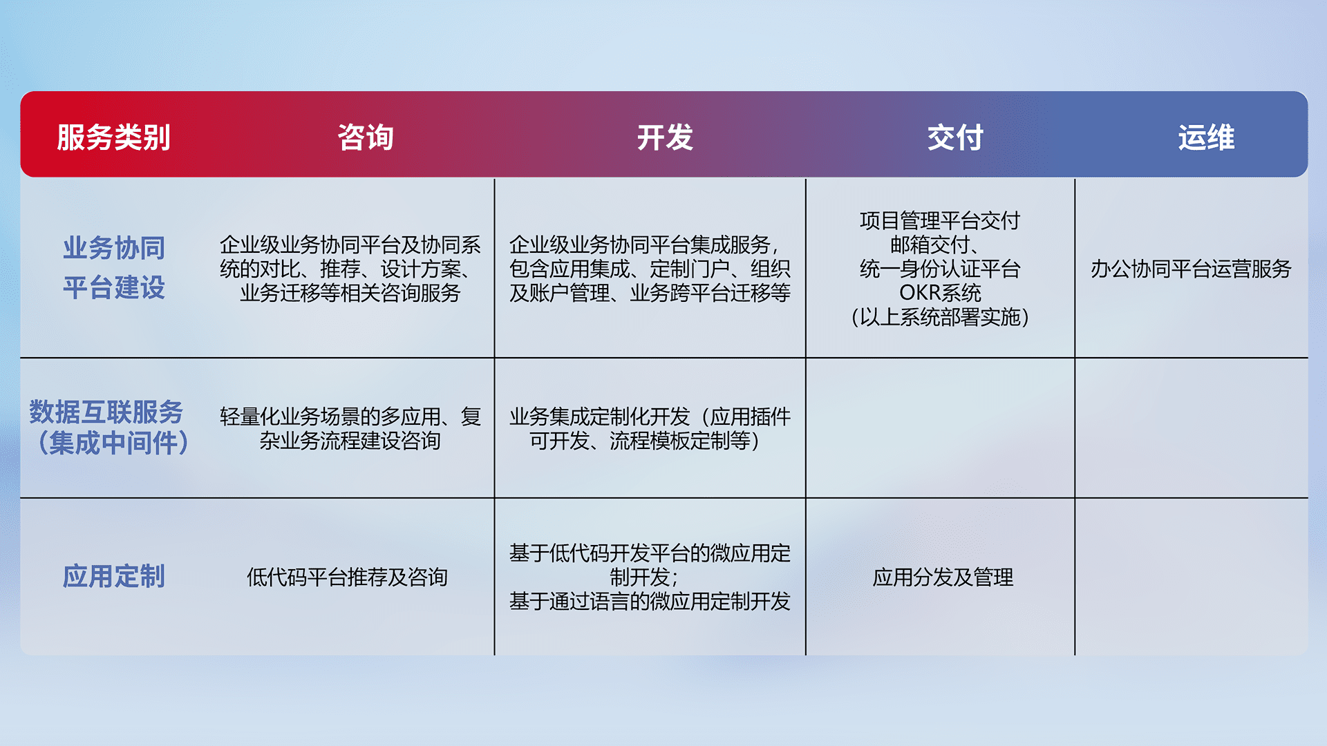 针对钉钉、、企微、、、IDaas等平台级产品提供产品的规划、、、、方案、、、交付、、定制化开发等服务,,,,实现如统一协同办公、、、、智能客户服务、、、混合会议管理、、智能数据查询、、等业务场景,,,实现数字化转型。。