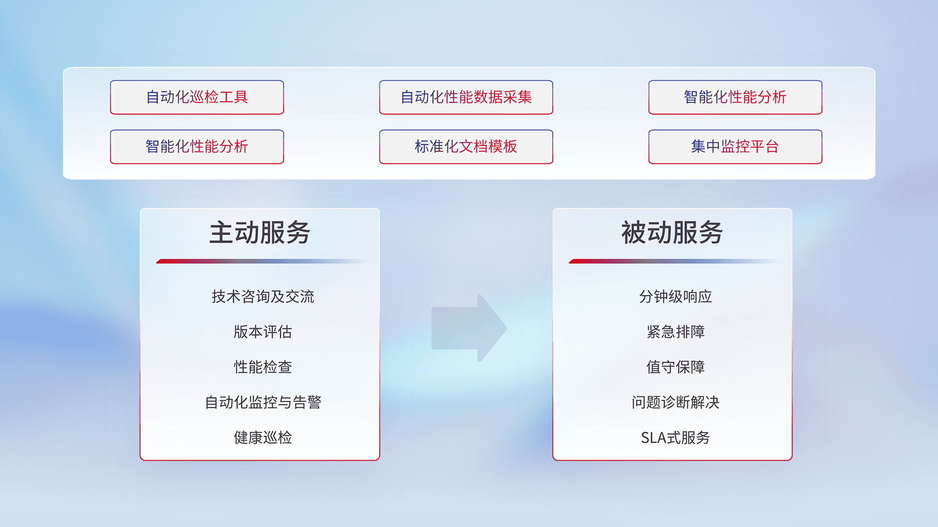 智能化工具和标准化文档,,,保障服务质量,,,提供主动服务(包含技术咨询、、版本评估、、性能检查、、、、自动化监控与告警、、、健康巡检)和被动服务包含(分钟级响应、、、紧急排障、、、、值守保障、、问题诊断解决、、、SLA服务)。。
